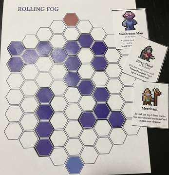 Rolling Fog is a single-player print & play table-top hex crawl adventure. Players will traverse across a map while avoiding a dangerous shifting fog and engaging in light RPG-esque battles against wicked monsters!